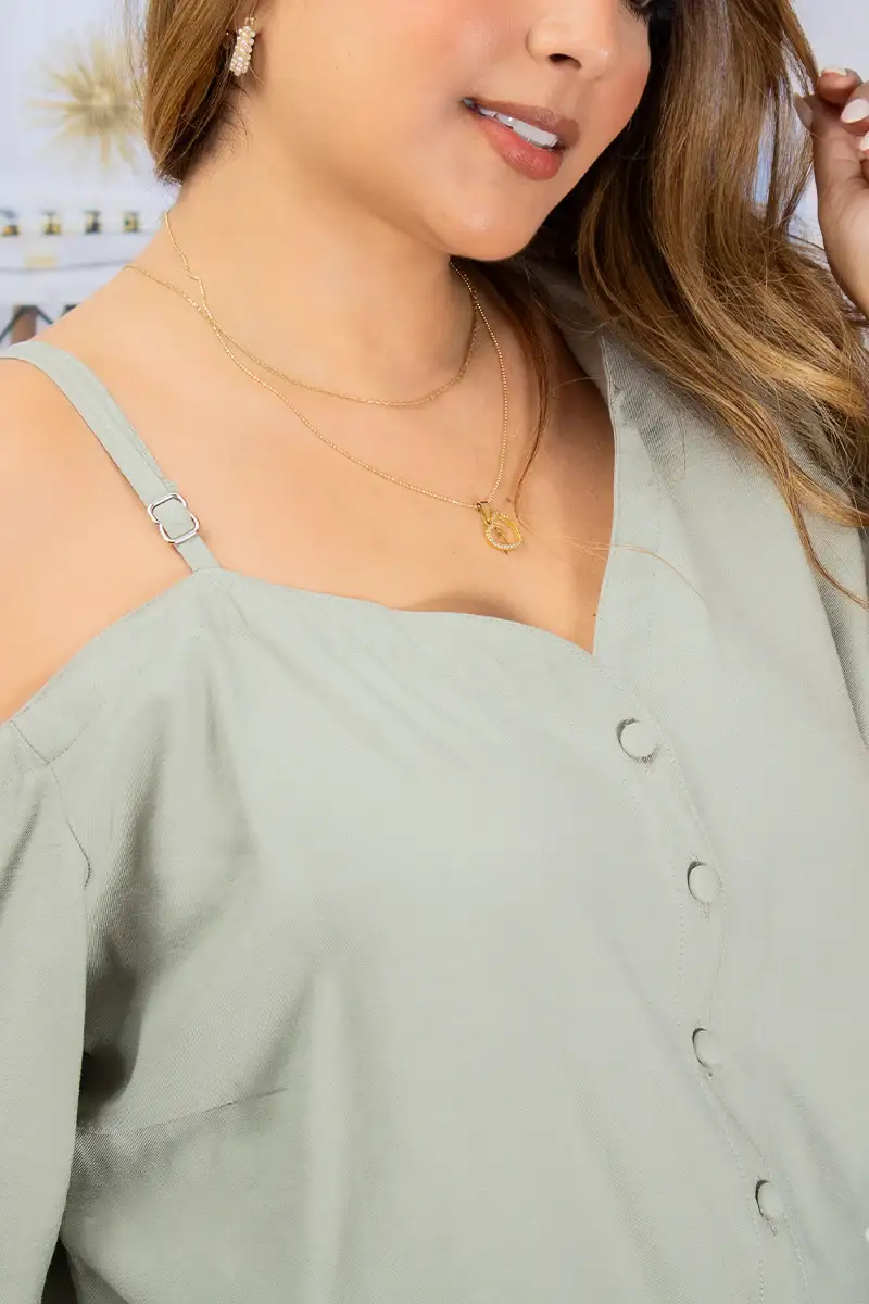 Blusa Cuello Asimétrico Con Tira ajustable en hombro y Botonadura frontal. Silueta Semi ajustada Sin elongación. Disponible en color Verde Oliva, Ivory, Kaki y Negro.