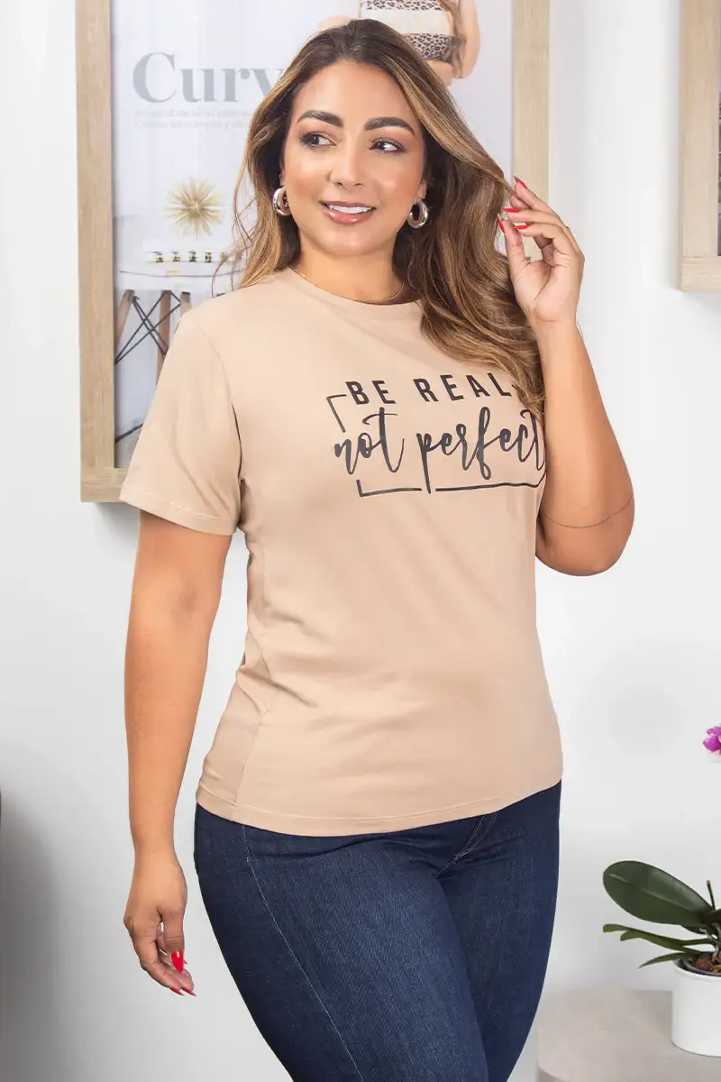 Camiseta Básica Estampado Frontal, Silueta Semi Ajustada con elongación. Disponible en Color Kaki, Blanco y Palo de Rosa.
