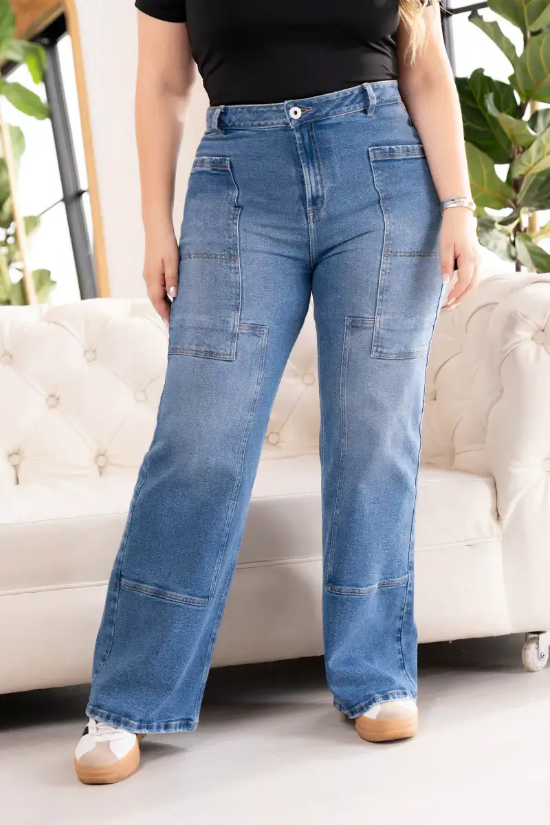 Jean Wide Leg Tiro Alto Bolsillos Frontales Tipo Parche Marca Trucco´s Plus Size